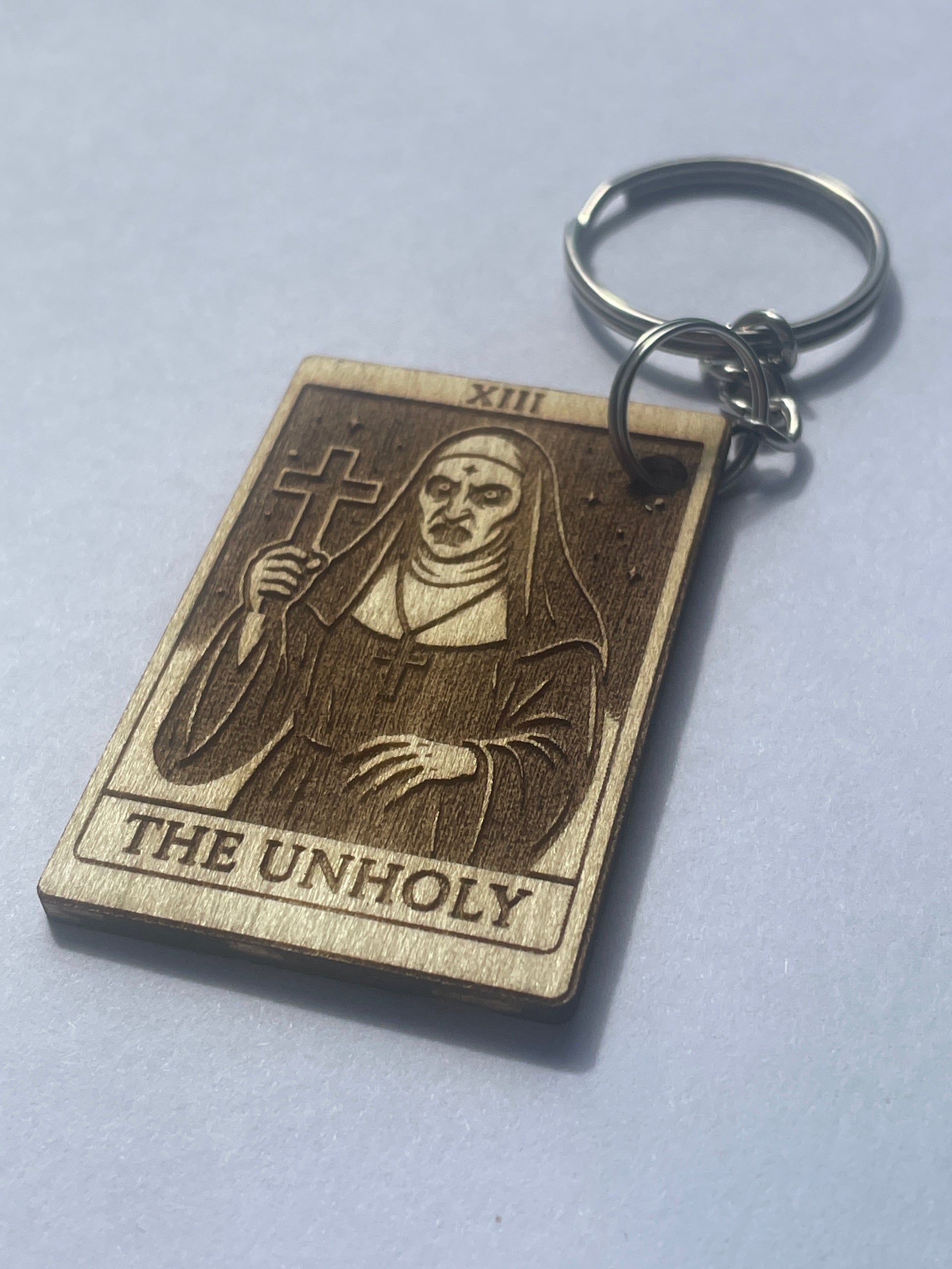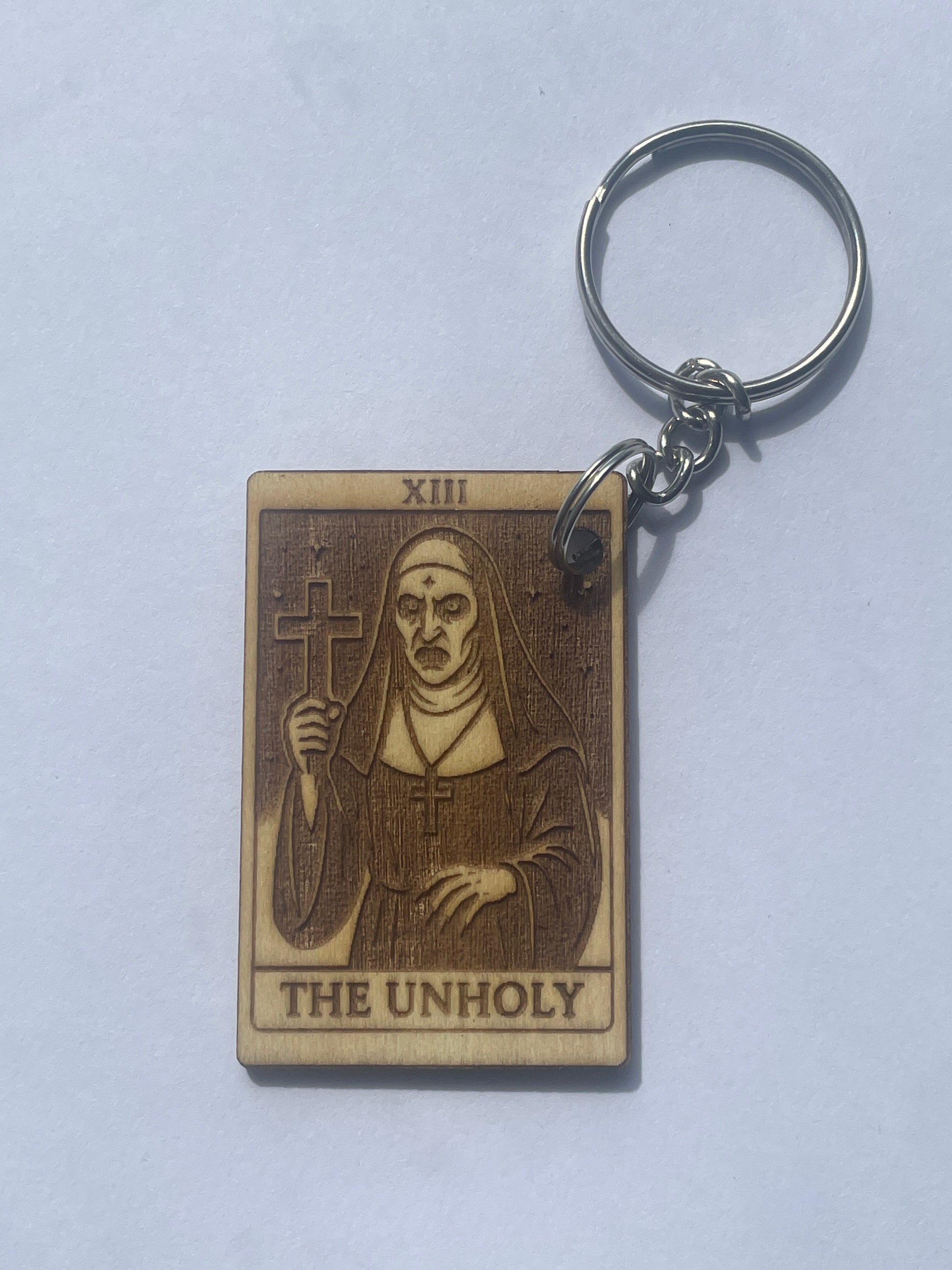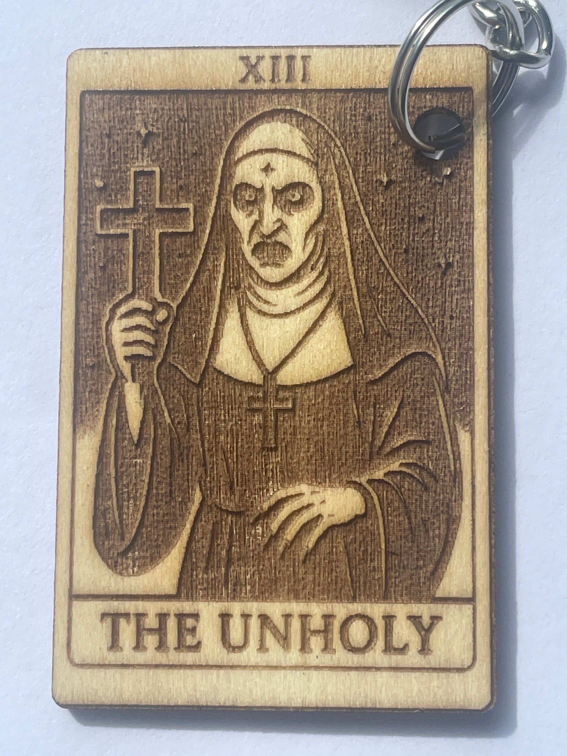 Summon the darkness with this Unholy Tarot Keychain, a handmade wooden accessory inspired by Valak, the terrifying nun from The Conjuring universe. Designed with gothic tarot flair and occult vibes, this eerie keyring captures the chilling essence of religious horror in a pocket-sized charm.
