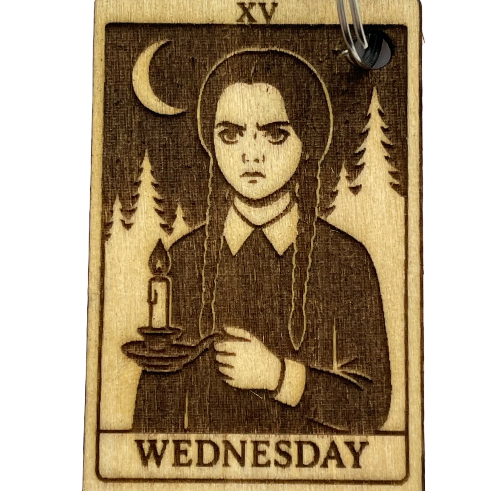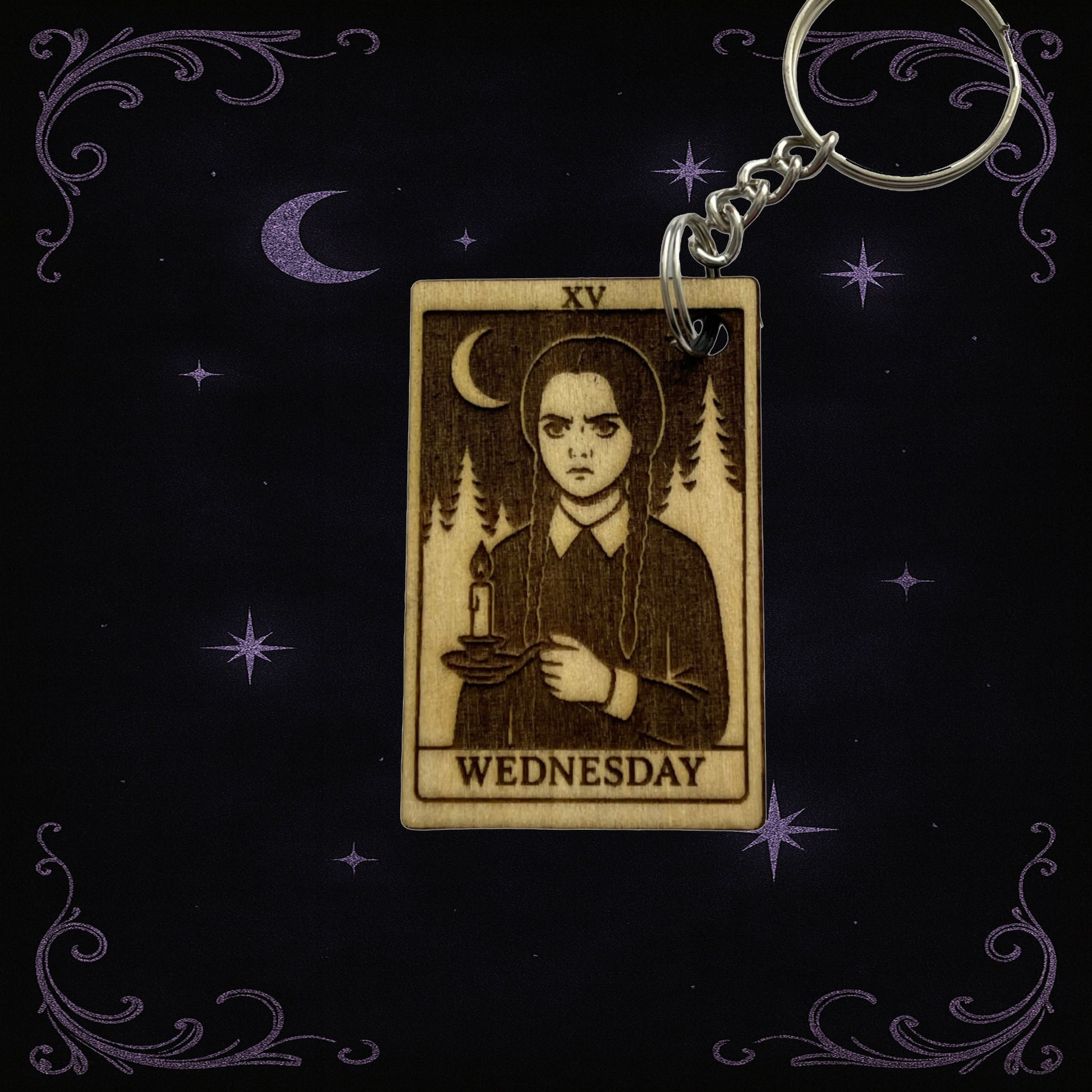 Gothic tarot keychain inspired by Wednesday Addams. Handmade spooky gift for Addams Family fans and lovers of dark academia style