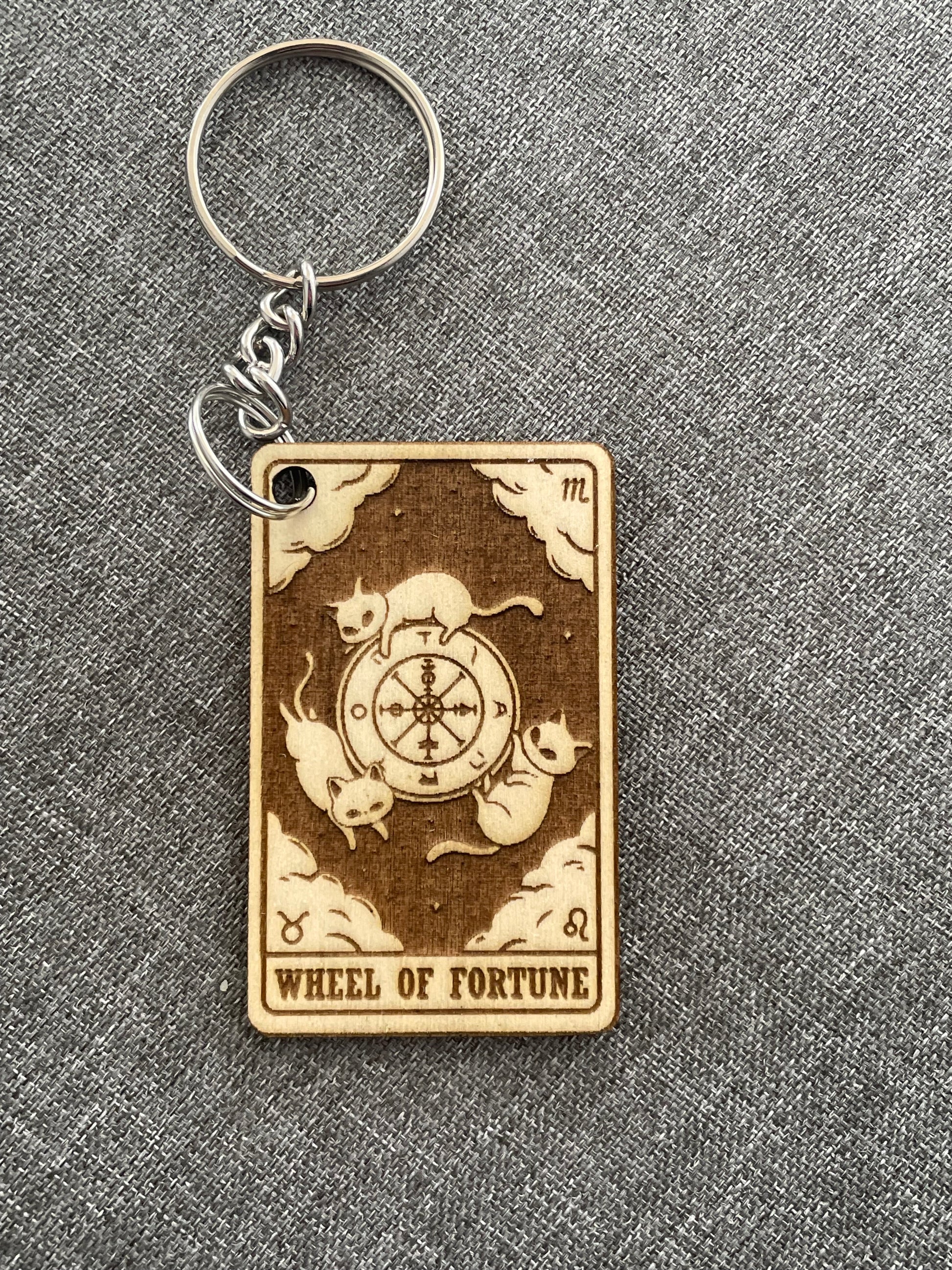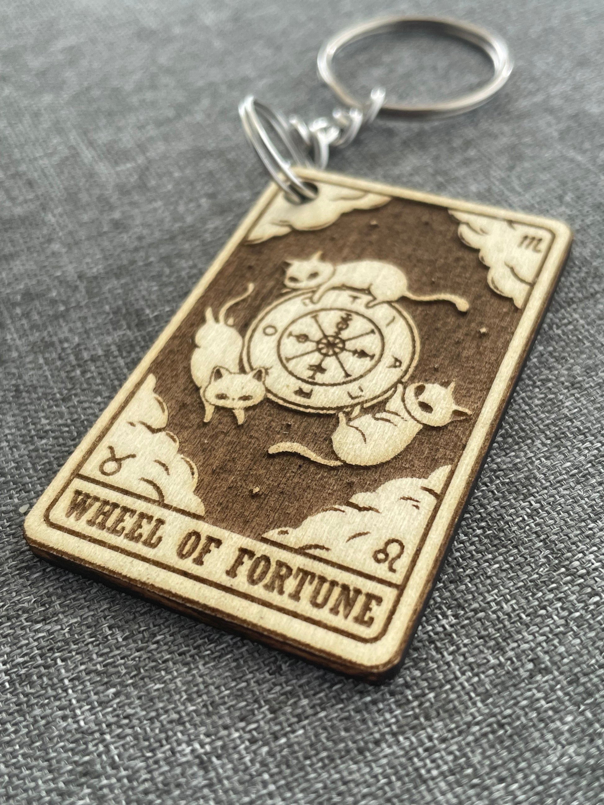 Tarot Cat Keychain – Wheel of Fortune Wooden Witchy Gift